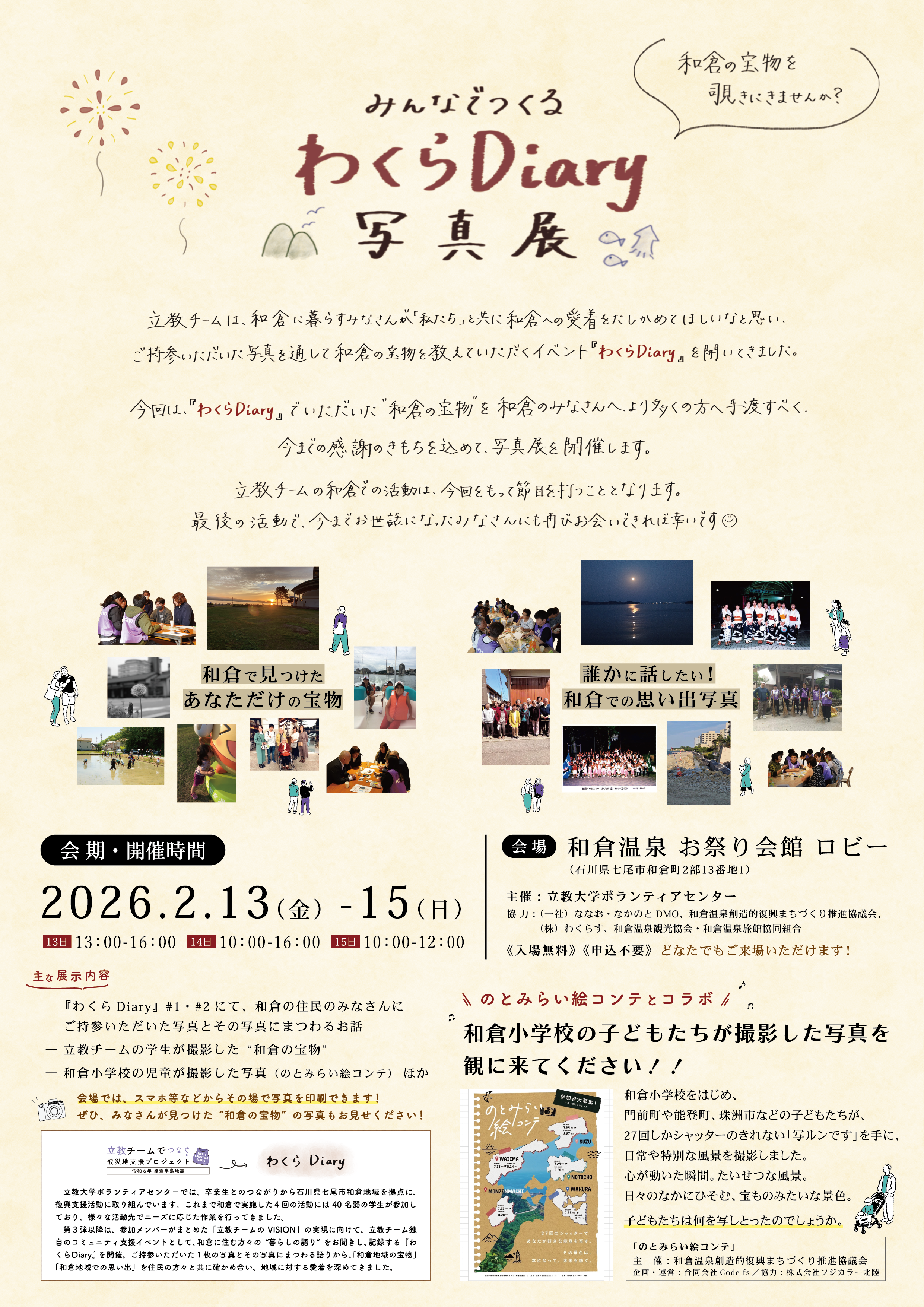 【2/13~15開催】わくらDiary写真展 「わくらDiary写真展」 開催日:2026年2月13日(金)~15日(日)時間: 13日13:00-16:00、14日10:00-16:00、15日10:00-12:00 会場:和倉温泉 お祭り会館ロビー 石川県七尾市和倉町2-13 主催:立教大学ボランティアセンター 当日の様子はこちら ←前へ